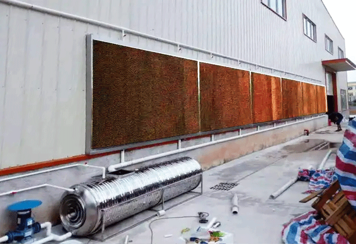 第二種方式是采用福泰負壓式水簾風機,就是水簾和風機搭配才能起到一個比較好的降溫效果,那它的特點是可以做到通風換氣,降溫除塵,但是它有缺點要遮光,所以說你能接受遮光的話,可以采用負壓式水簾風機。
