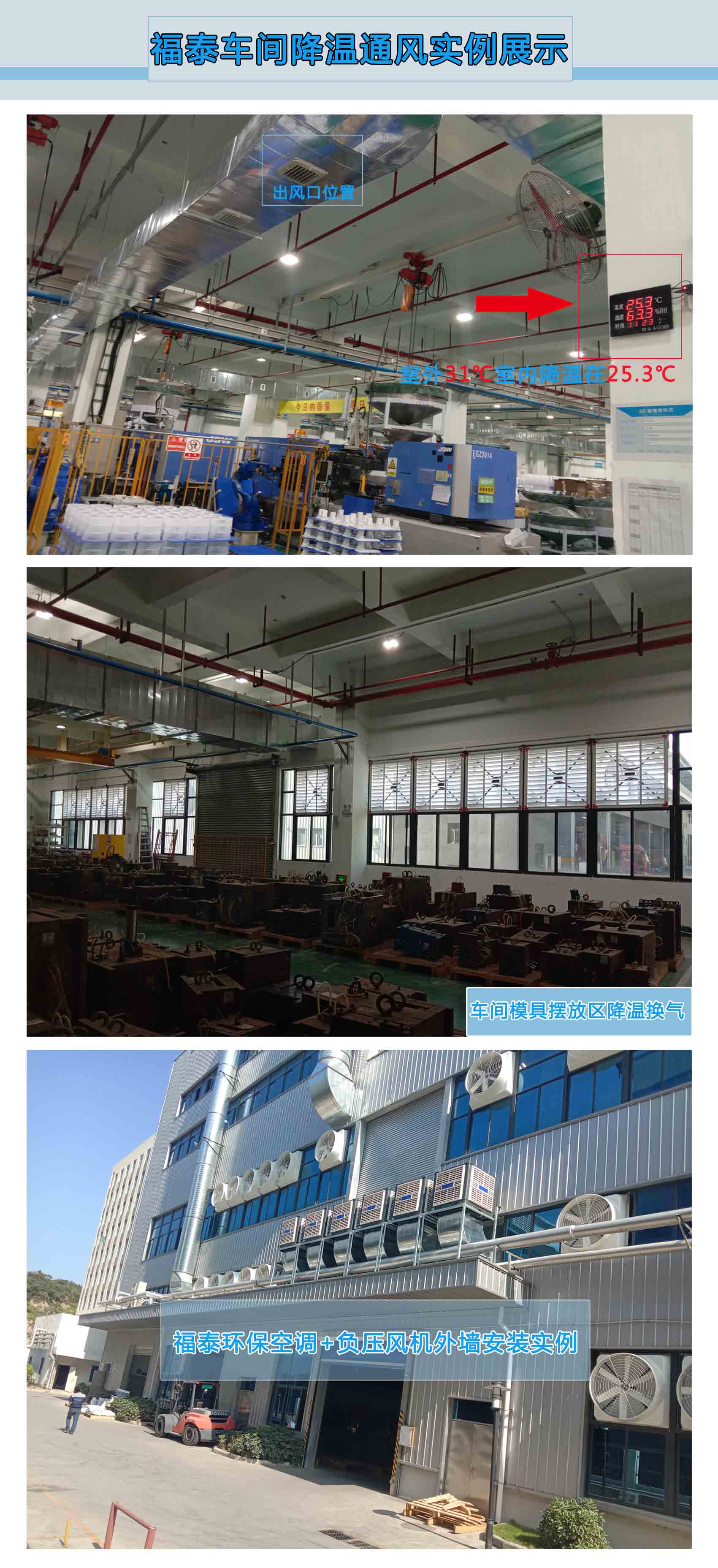 使用福泰水簾風機一體機(水簾和負壓風機合成后安裝在廠房的一邊,送風距離遠,降溫效果明顯)這些降溫方式適合于工廠,耗電量低同時可以改善工作環境。不同的廠房車間對換氣次數、噪音要求、投資運算有不同的要求,對于客戶的需求,我們可以提供不同型號、不同款式的降溫產品和工廠車間降溫解決方案。